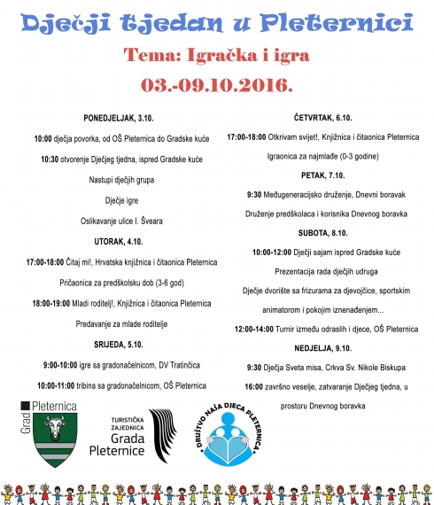 Završni dan Dječjeg tjedna kojeg i ove godine organizira Društvo naša djeca Pleternica je nedjelja. U dopodnevnim satima, točnije u 9 i 30 je Dječja Sveta misa u župnoj crkvi u Pleternici, a završno slavlje je u 16 sati u Dnevnom boravku.